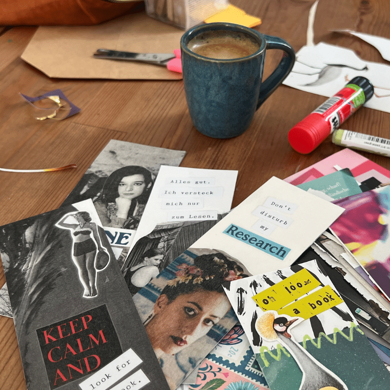 Für den ersten Termin haben wir ein Collagen-Projekt extra für Booklover gewählt, nämlich Lesezeichen. Aber auch größere Collage-Hintergründe sind vorhanden für Postkarten, individuelle Tarotkarten oder Kunstwerke in A5.